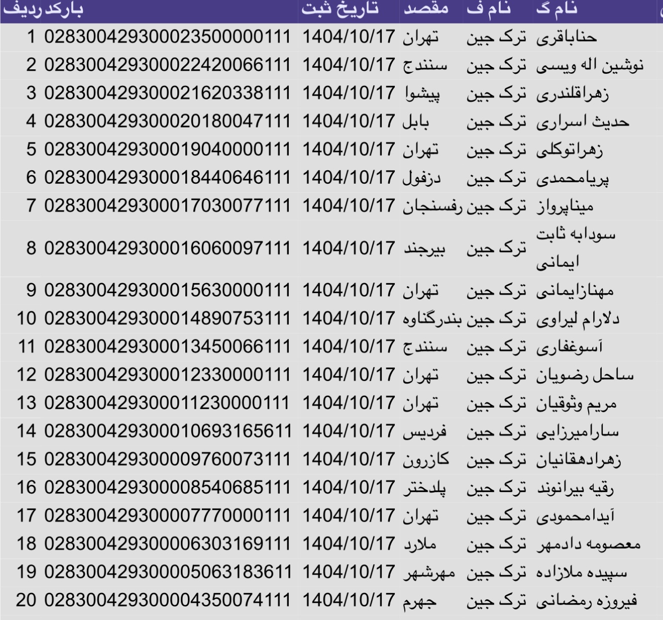 لیست ارسالی های پست